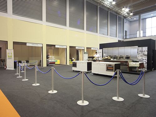 Pedestal post with round base, equipped with a ring in the upper part to attach the rope with carabiner.